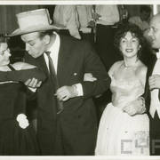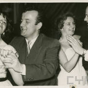 Janusz Przewoźny z żoną, Izabela Nowakowa, dyr. wydawnictwa (?) Mikołaj Zabiełło, Stefania Cholewczyńska-Derwich, fotograf Eugeniusz Kitzman, klęczy Henryk Derwich na balu w budynku Prasy1958