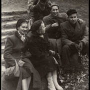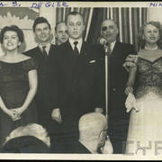 Stefania Cholewczyńska-Derwich, lekarz Jan Hasik, Izabela Nowakowa, Ada Hasikowa, Henryk Derwich, nn i Hanna Dobrzanka-Winiecka na balu w budynku Prasy przy ul. Grunwaldzkiej1958–1959