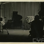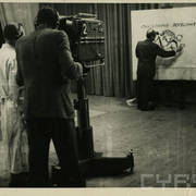 Henryk Derwich przed kamerami poznańskiej telewizji w studio przy ul. Głogowskiej, operatorem był Kazimierz Rajzauer, po jego lewej stronie Konobrodzki01.05.1957