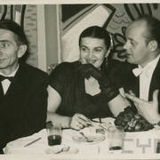 Karykaturzysta Tadeusz NOT-Nowicki, dziennikarka Magda Strumian i Henryk Derwich na balu w budynku Prasy przy ul. Grunwaldzkiej, w tle dekoracje autorstwa Derwicha