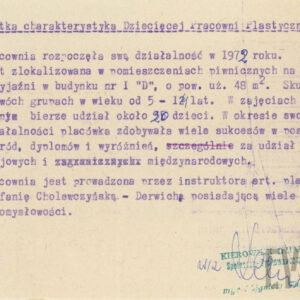 Informacja o działalności pracowni plastycznej dla dzieci Paleta prowadzonej przez Stefanię Cholewczyńską-Derwich w piwnicy bloku nr 1D na os. Przyjaźni1976