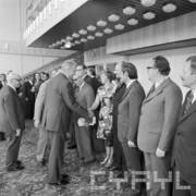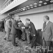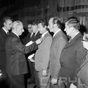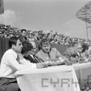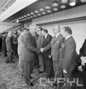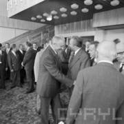 Piotr Jaroszewicz, prezes Rady Ministrów, wita gości Centralnych Dożynek w Centrum Prasowym Stadionu im. 22 Lipca