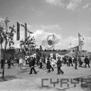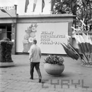 Plakat reklamowy Centralnych Dożynek przy bramie Zakładów Przemysłu Metalowego H. Cegielski