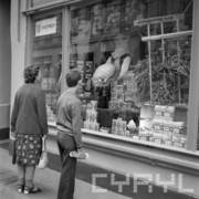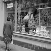 Witryna sklepu spółdzielczego z okolicznościową ekspozycją towarów nawiązującą do Centralnych Dożynek