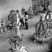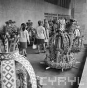Wystawa wieńców dożynkowych w holu Wojewódzkiej Rady Narodowej (obecnie Urząd Wojewódzki) przy al. Stalingradzkiej (dzisiaj al. Niepodległości)