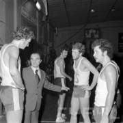 Koszykarze AZS z trenerem Stanisławem Szafarkiewiczem w przerwie meczu z KS Warta