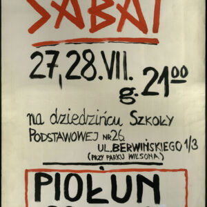 Ręcznie malowany afisz spektakli Sabat i Piołun Teatru Ósmego Dnia na dziedzińcu szkoły przy ul. Berwińskiego