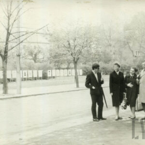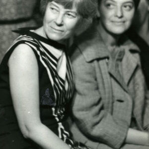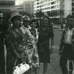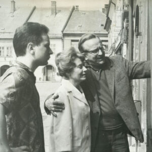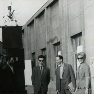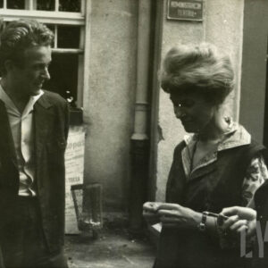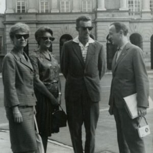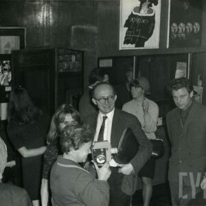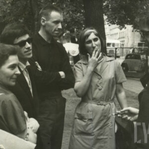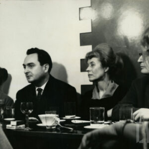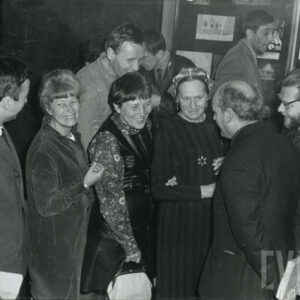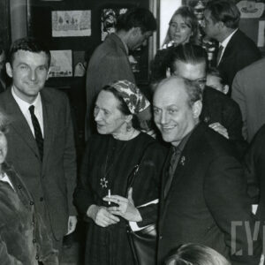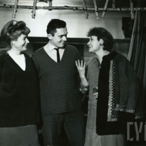 1964Leokadia Serafinowicz (z lewej) w rozmowie z autorami scenografii do spektaklów Teatru Lalki i Aktora Marcinek rzeźbiarką Jettą Donega, autorką m.in. scenografii do spektaklu Biją dzwony Zbigniewa Wojciechowskiego oraz rzeźbiarzem Janem Berdyszakiem