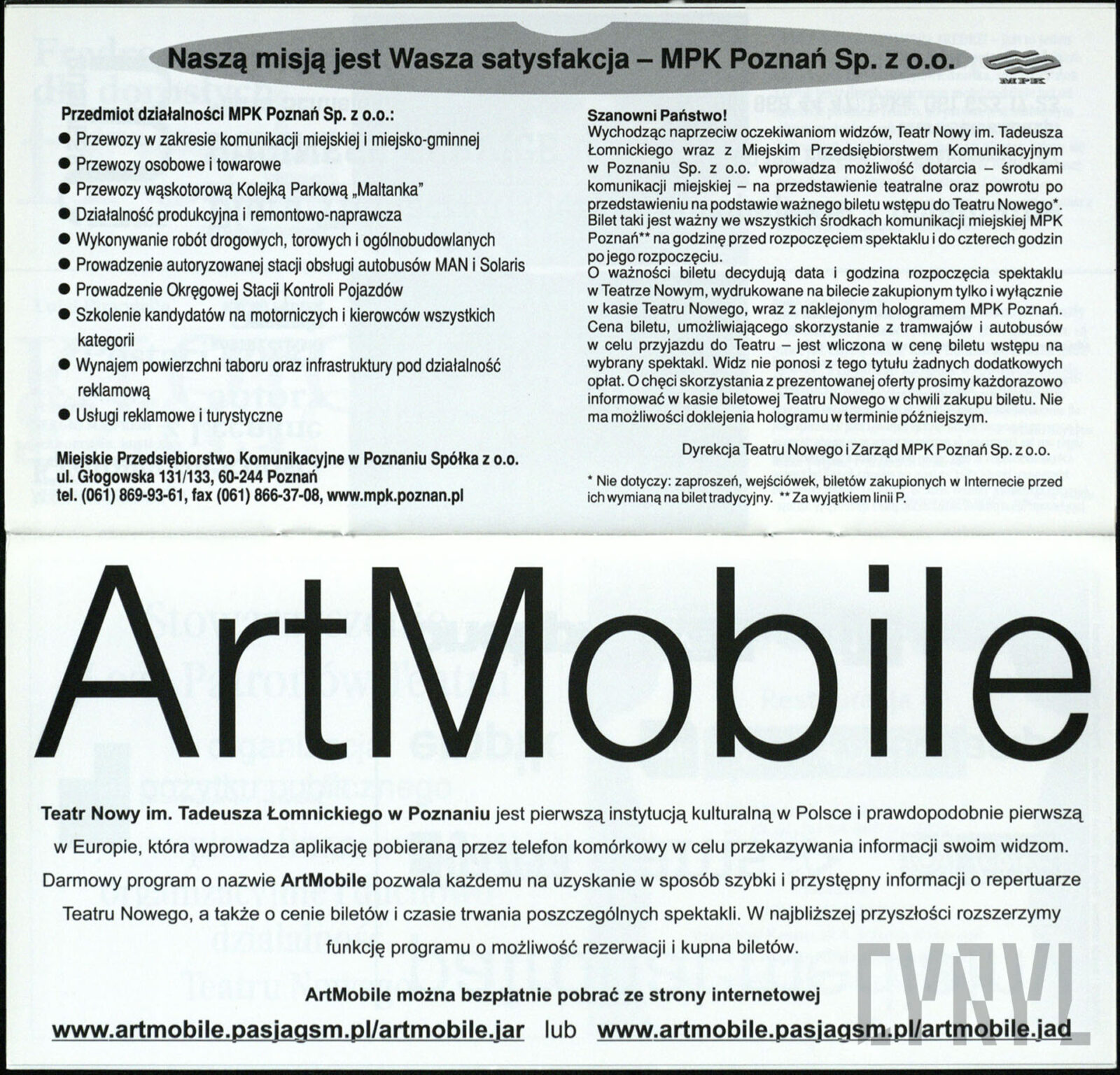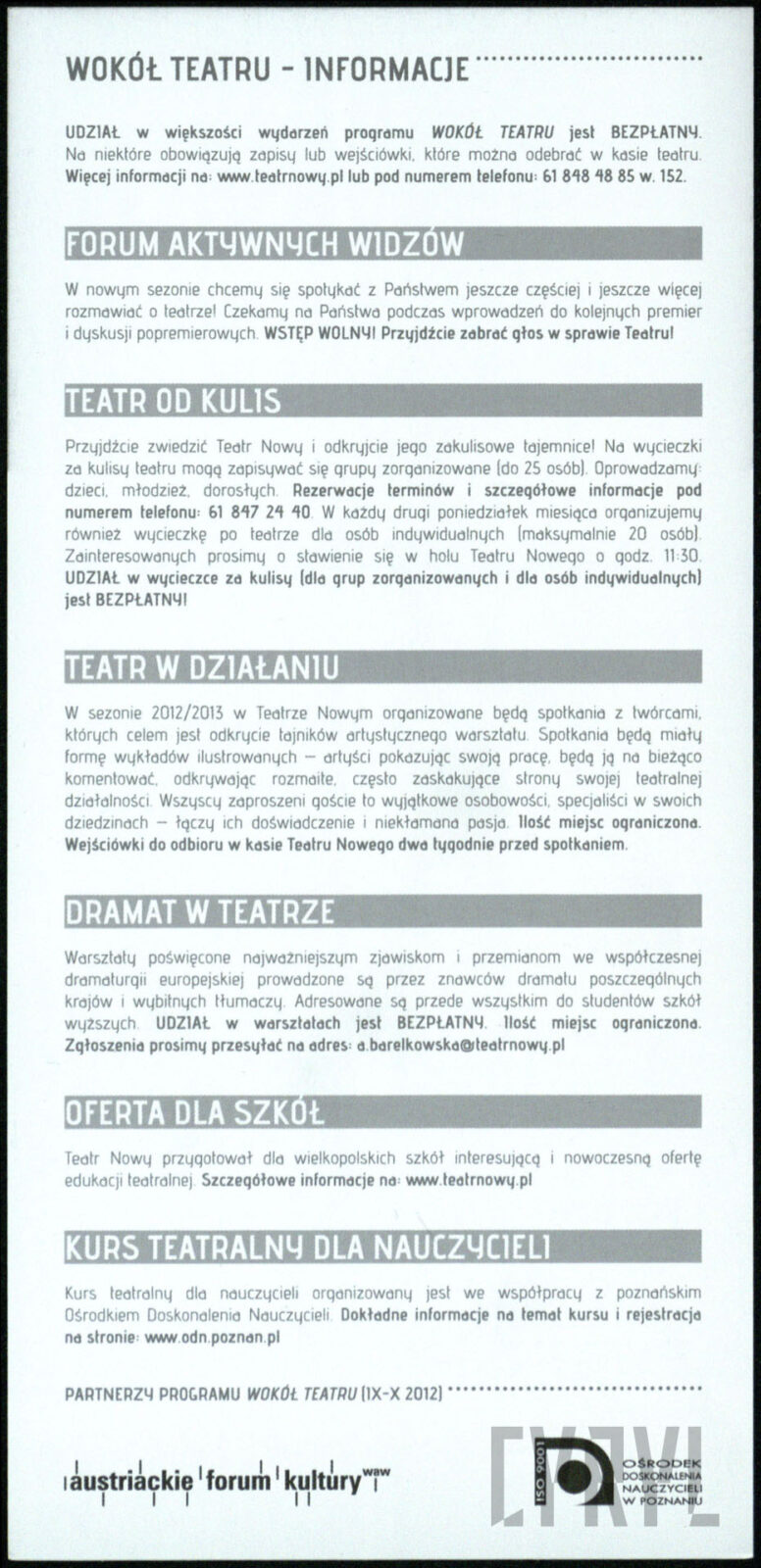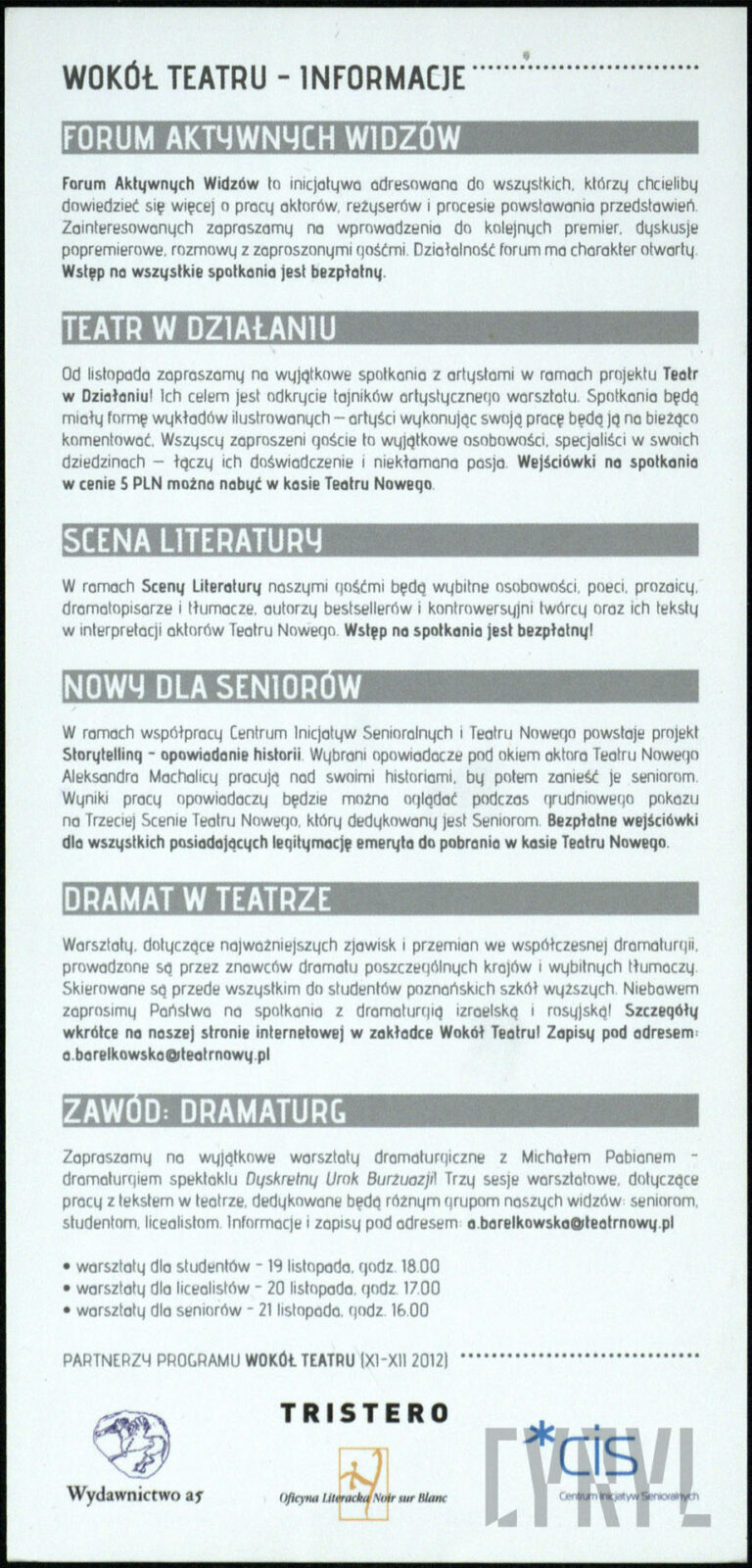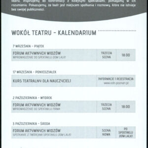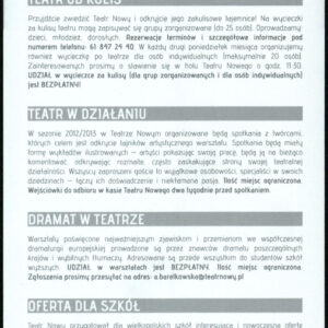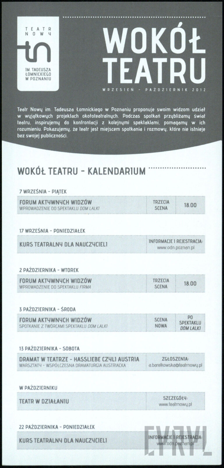 Kalendarium projektów okołoteatralnych, dodatek do repertuaru Teatru Nowego we wrześniu i październiku 2012 roku
