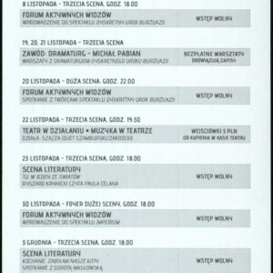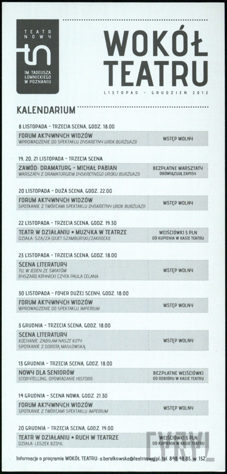 Kalendarium wydarzeń okołoteatralnych, dodatek do repertuaru Teatru Nowego w listopadzie i grudniu 2012 roku