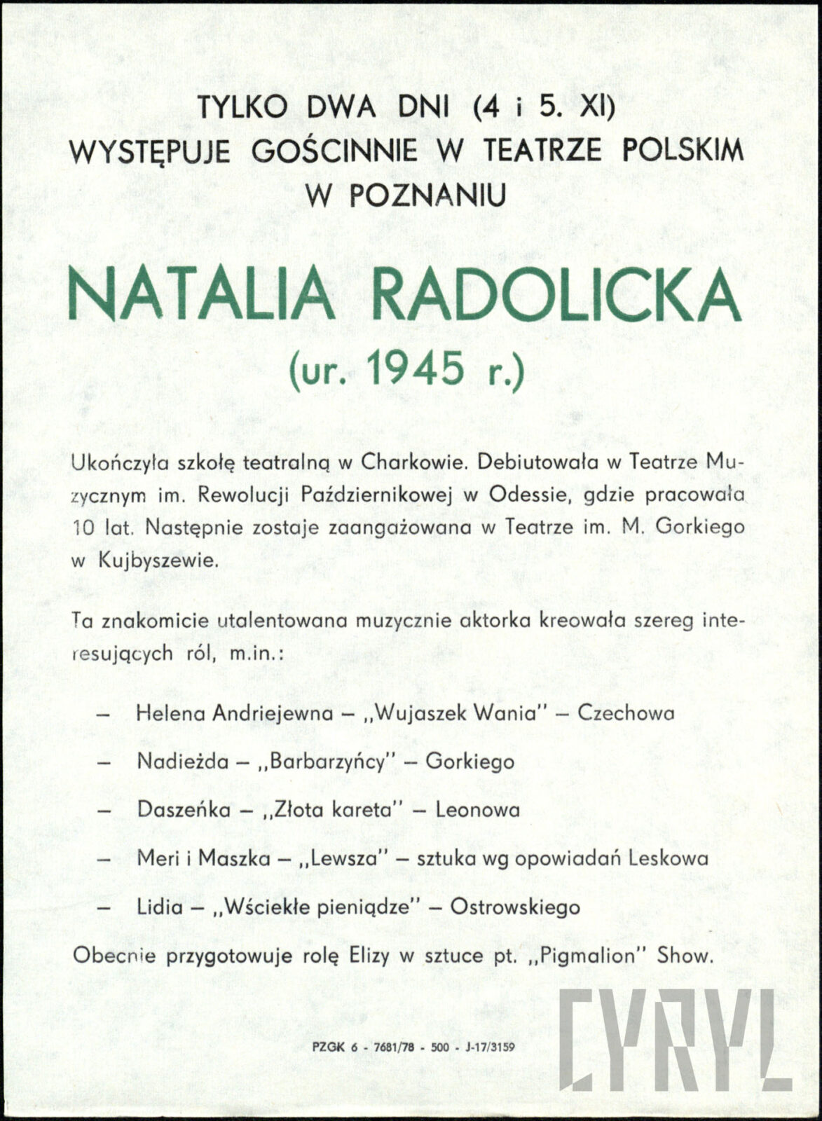 Wkładka do programu zapowiadająca występ Natalii Radolickiej w spektaklu "Wściekłe pieniądze" Aleksandra Ostrowskiego w Teatrze Polskim w Poznaniu