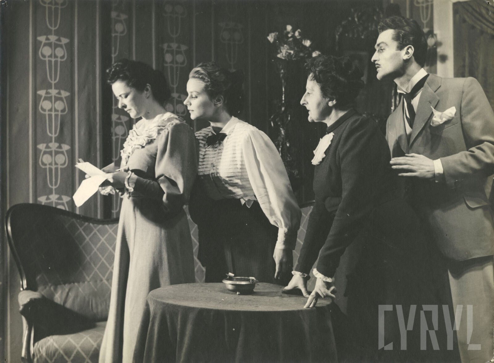 22.02.1952Scena zbiorowa spektaklu Ruchome piaski Piotra Choynowskiego wystawionego na deskach Teatru Nowego w Poznaniu, druga od prawej Irena Detkowska-Jasińska (Wróblewska)
