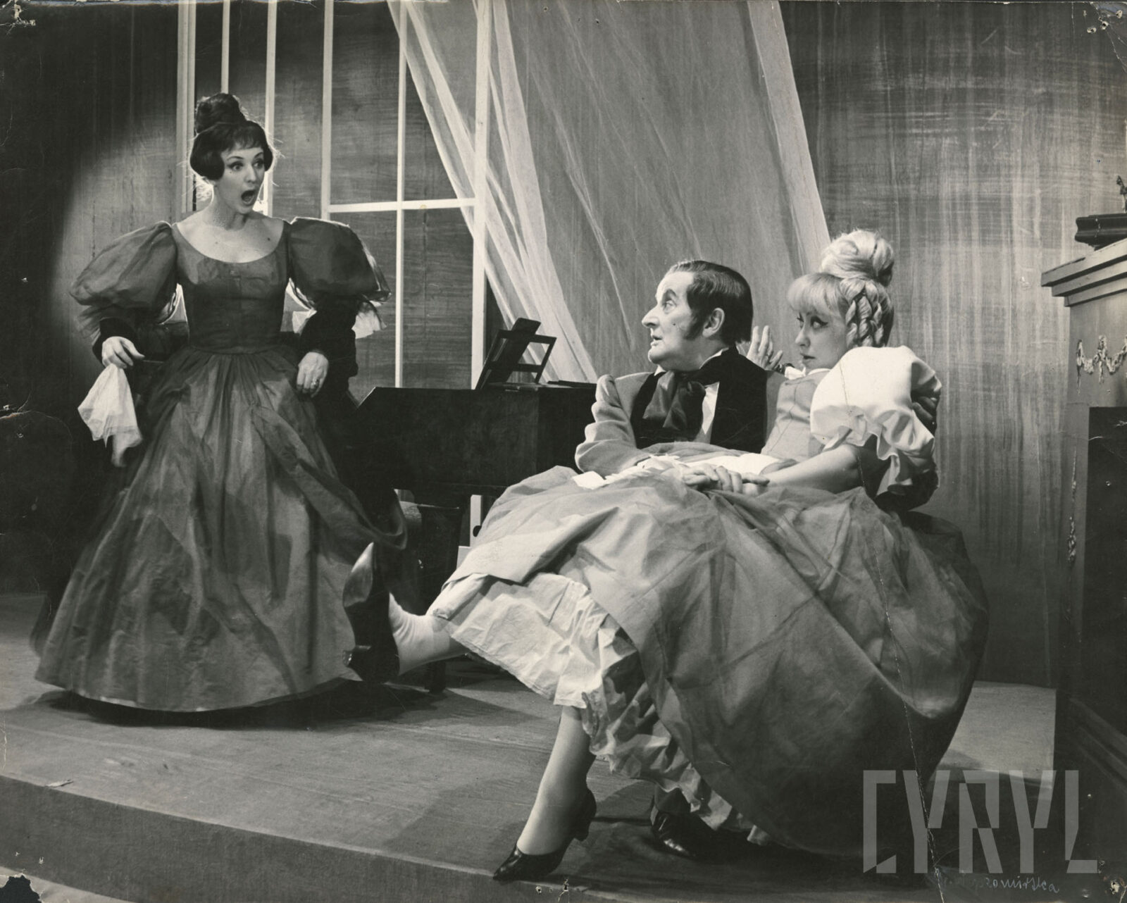14.01.1966Aleksandra Koncewicz (Elwira), Stefan Drewicz (Hrabia) i Jadwiga Żywczak (Justysia) w spektaklu Mąż i żona Aleksandra Fredry wystawionym na deskach Teatru Nowego w Poznaniu