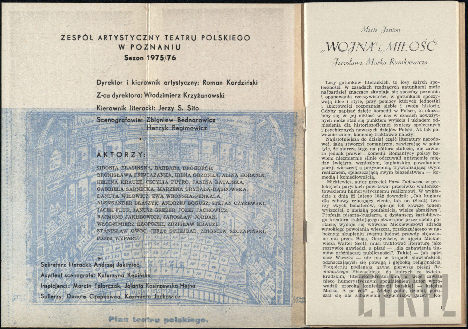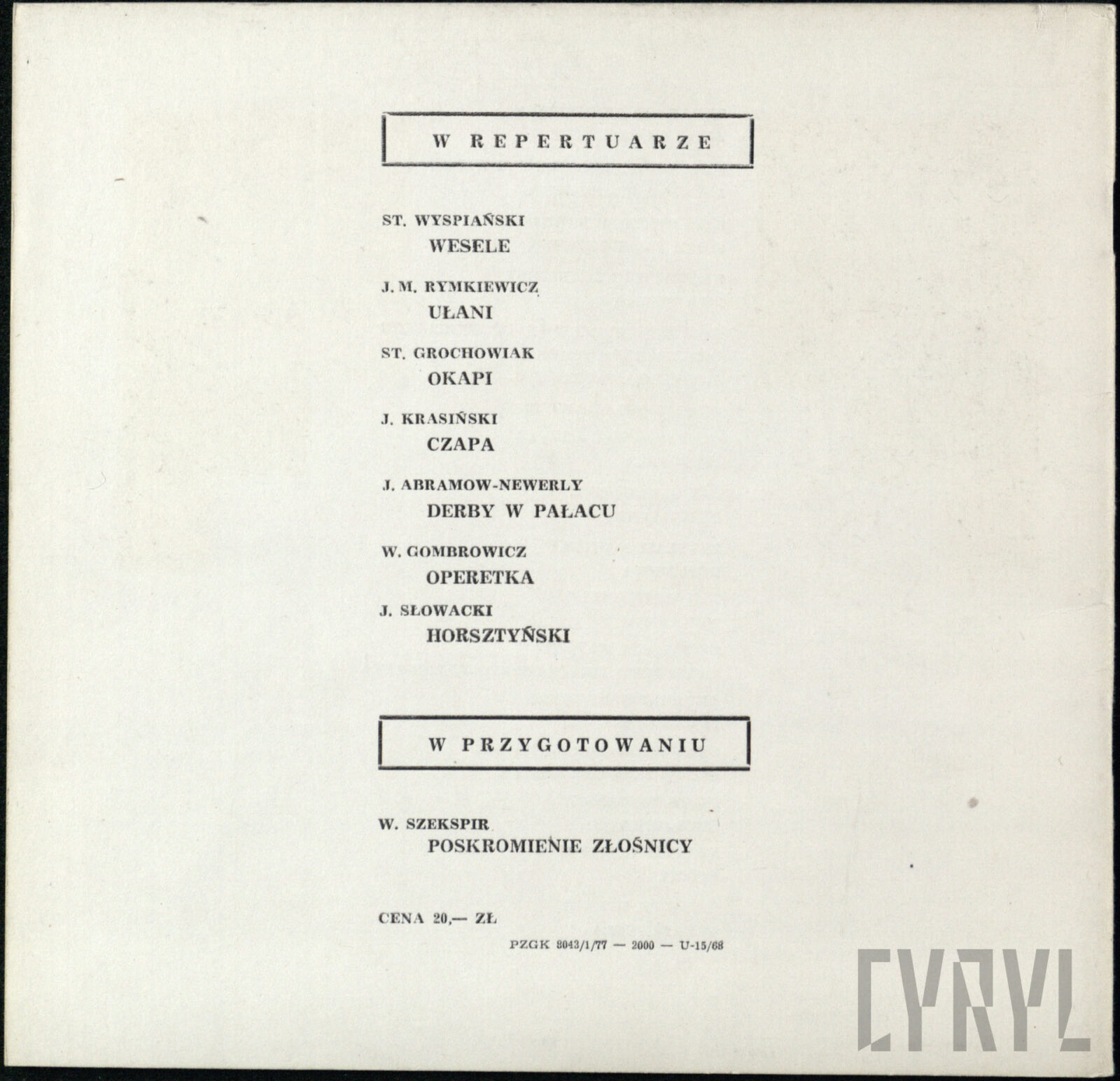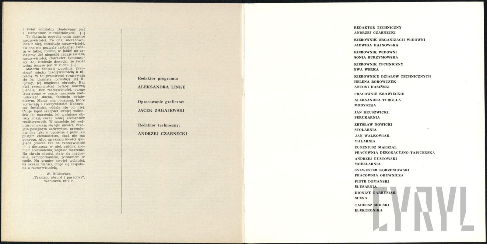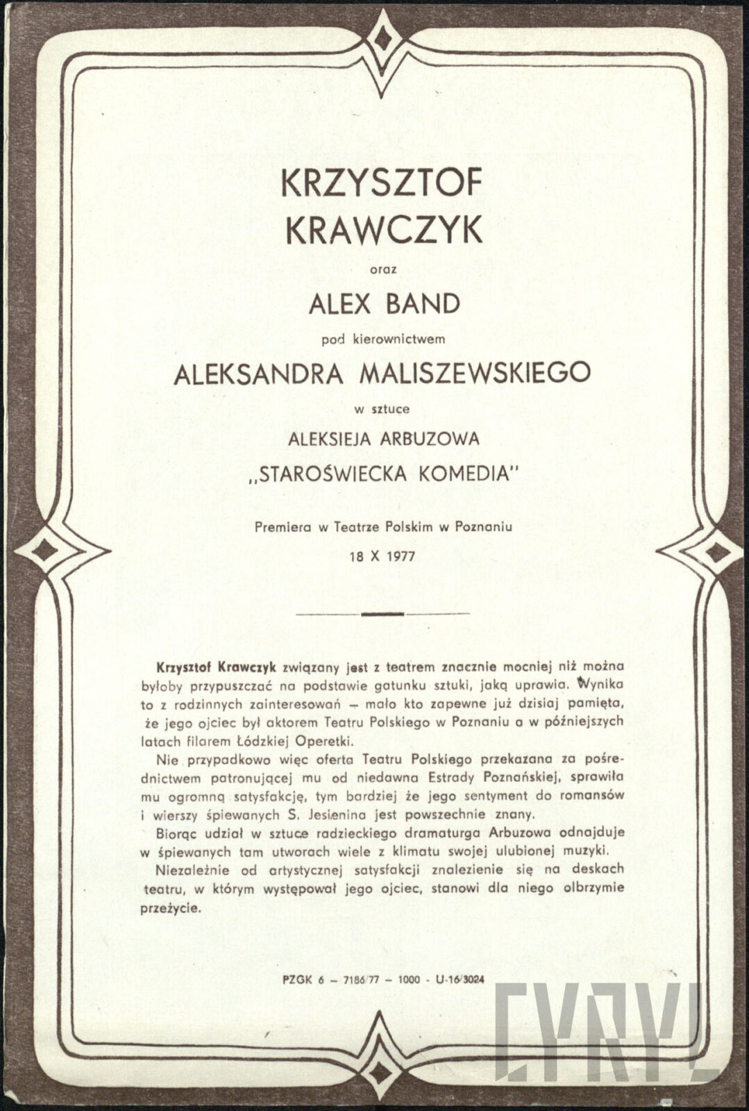 20.02.1972Program spektaklu Derby w pałacu Jarosława Abramowa-Newerlego w Teatrze Polskim w Poznaniu