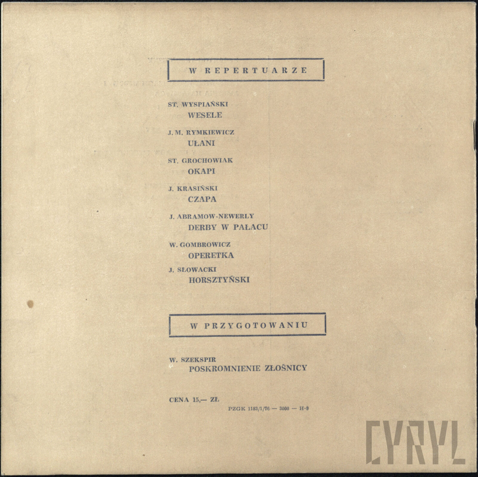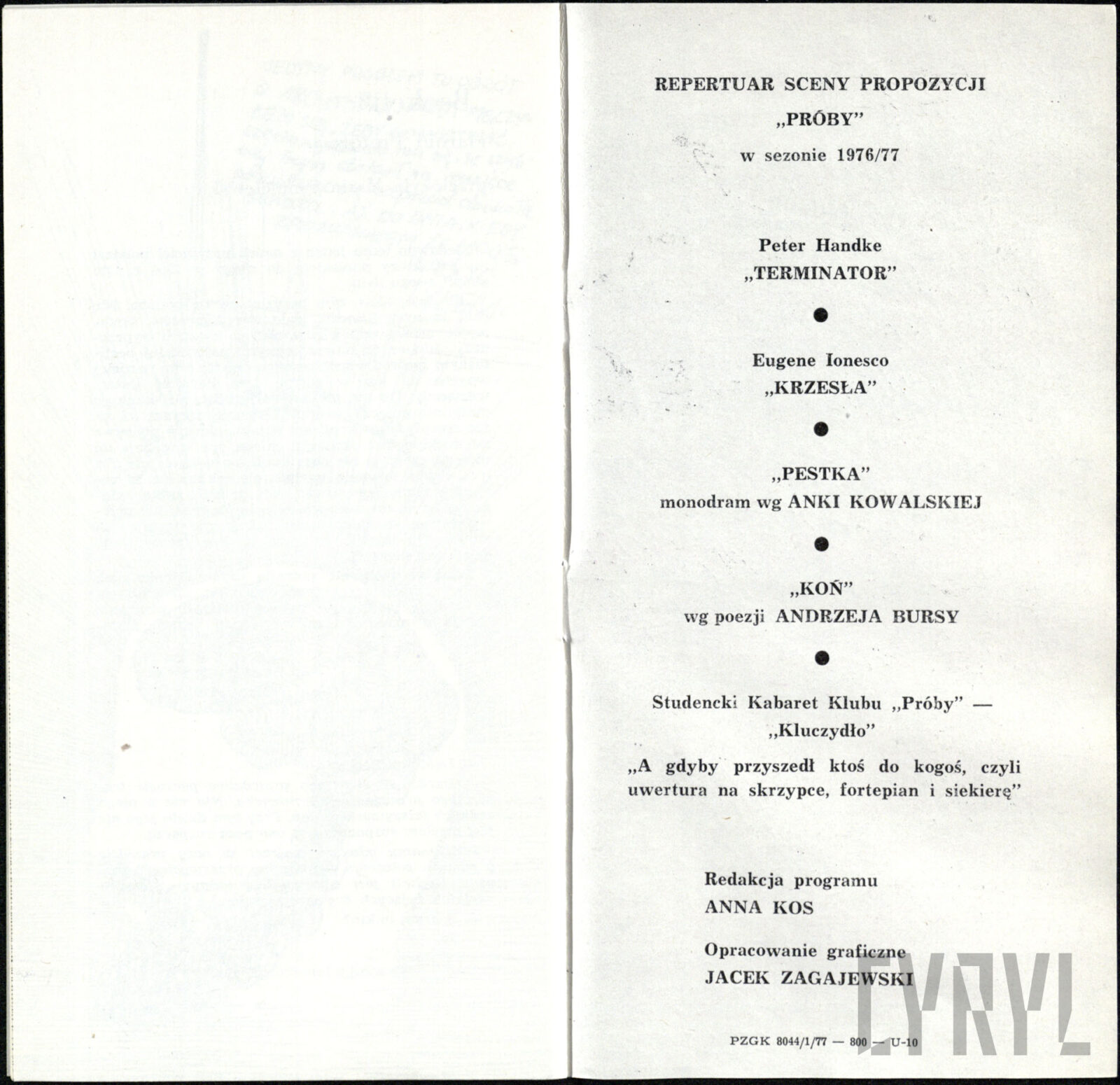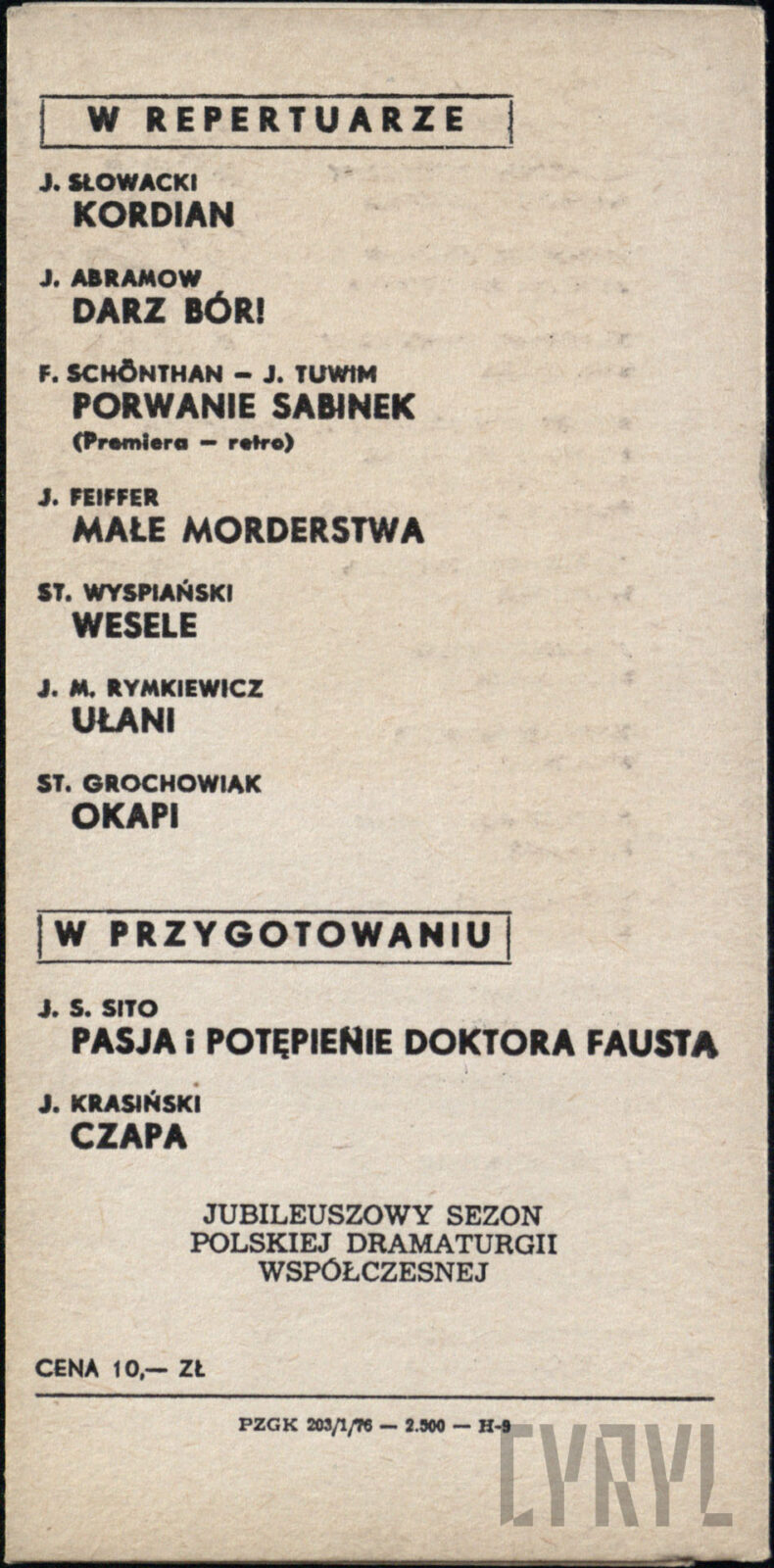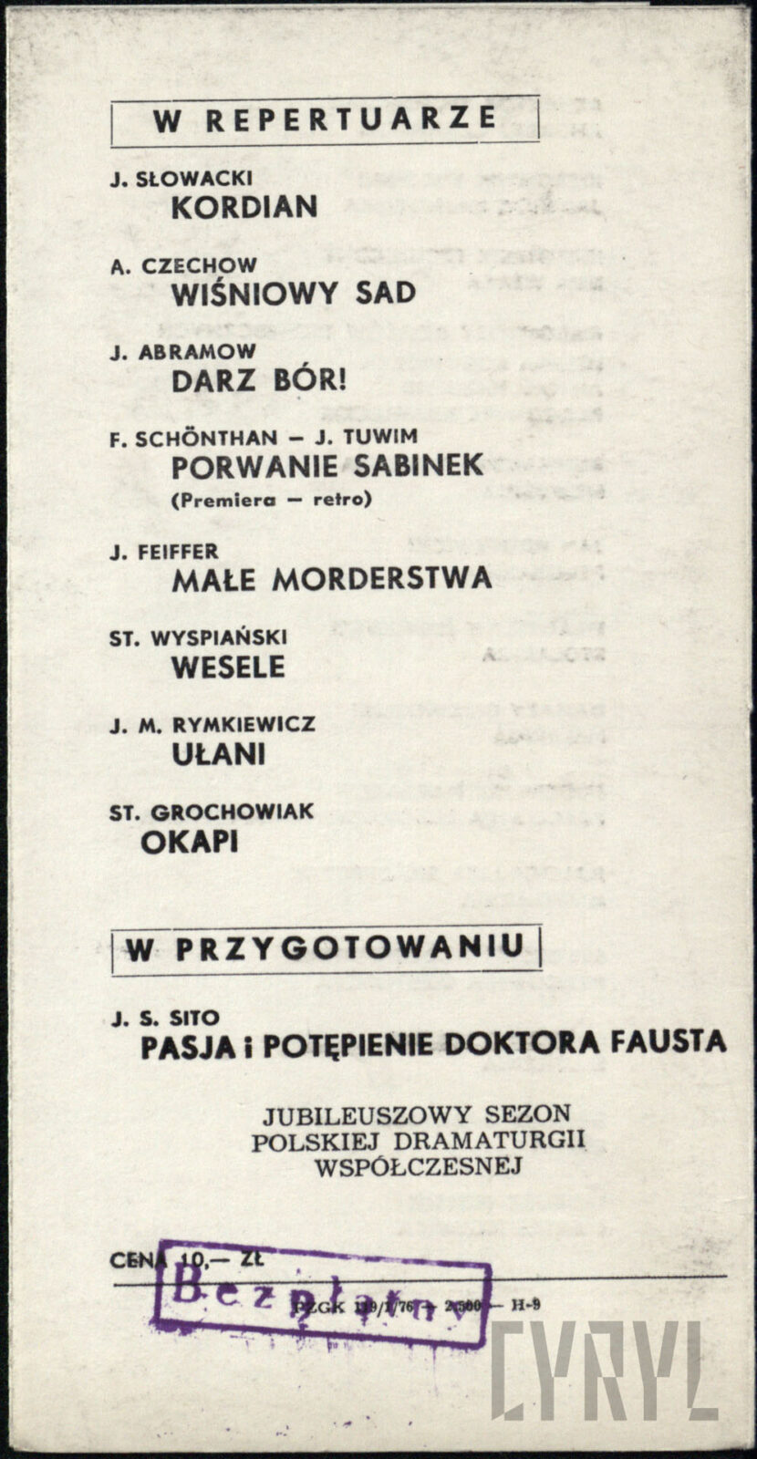 11.06.1976Program spektaklu Derby w pałacu Jarosława Abramowa-Newerlego w Teatrze Polskim w Poznaniu