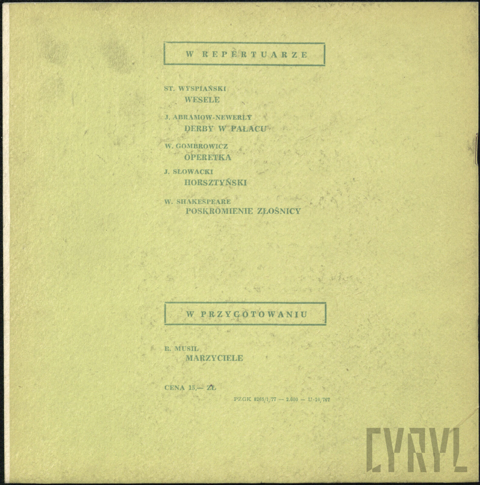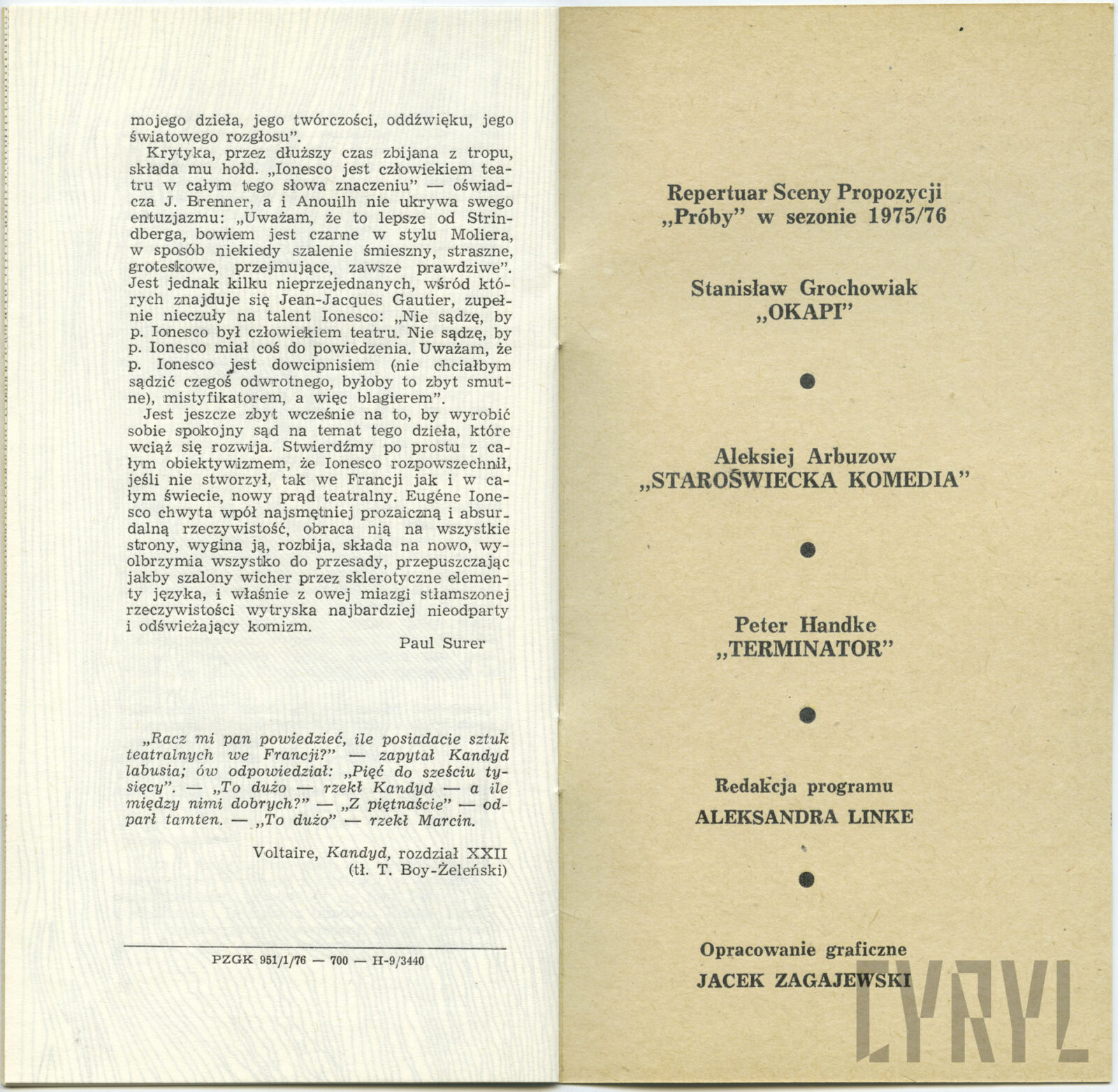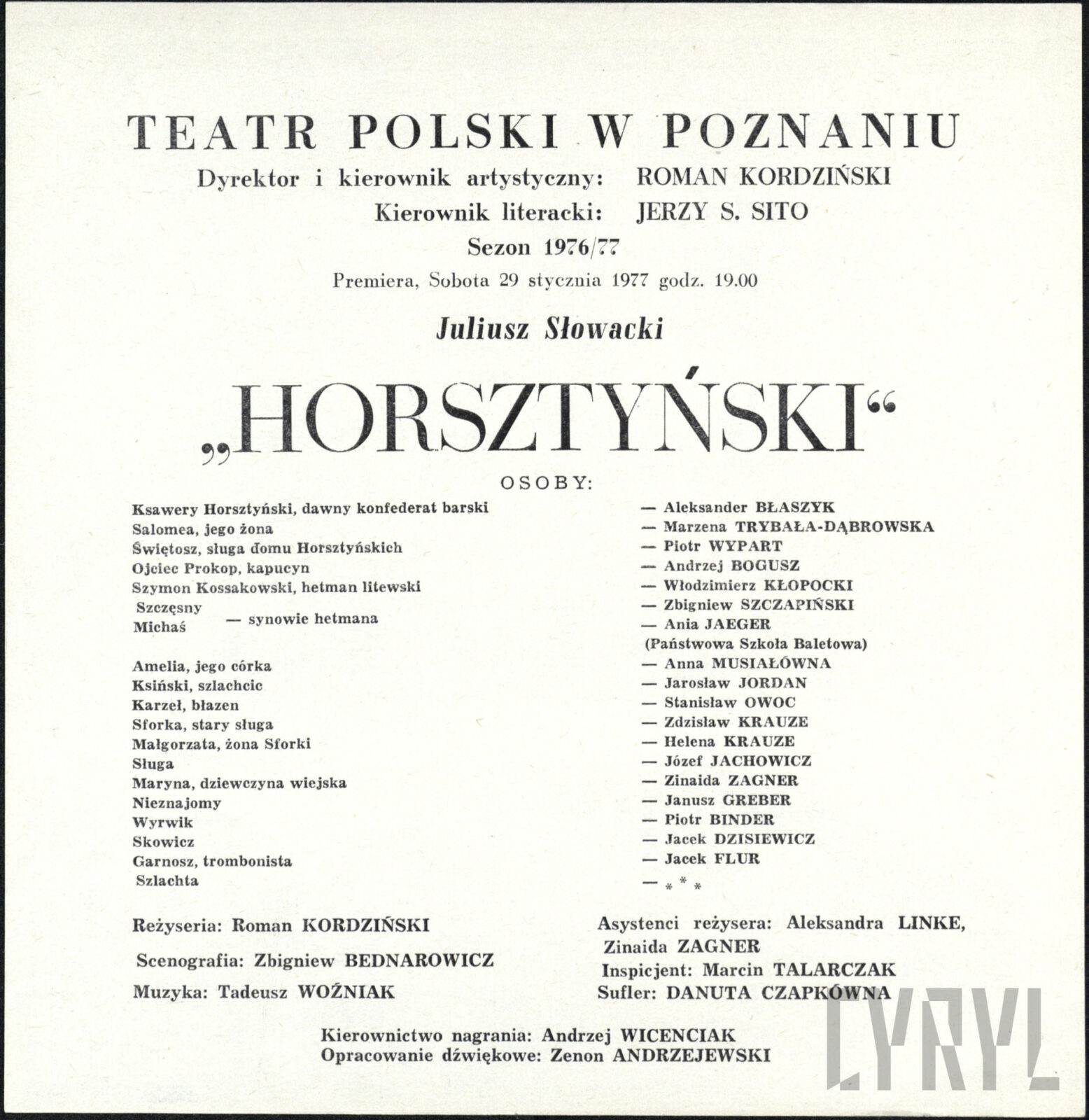 11.06.1976Program spektaklu Derby w pałacu Jarosława Abramowa-Newerlego w Teatrze Polskim w Poznaniu