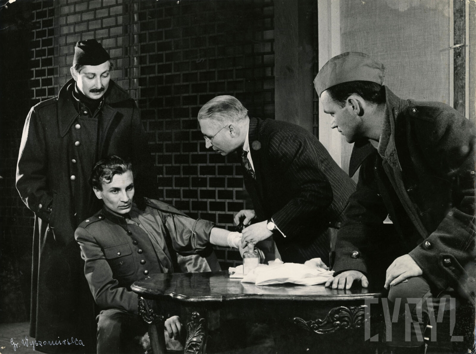 24.03.1960Eugeniusz Robaczewski (Hieronim), Rajmund Wolff (Jan), Stanisław Winiecki (Doktor) w spektaklu Pierwszy dzień wolności Leona Kruczkowskiego wystawionym na deskach Teatru Nowego w Poznaniu