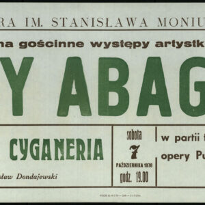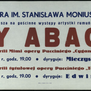 18.10.1978–19.10.1978Afisz gościnnych występów rumuńskiej solistki Aidy Abagief w partii Mimi w spektaklu operowym Cyganeria oraz w partii tytułowej opery Tosca Giacoma Pucciniego