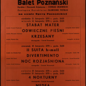 07.12.1978–10.12.1978Afisz spektakli baletowych Polskiego Teatru Tańca Baletu Poznańskiego: Stabat Mater, Odwieczne pieśni, Krzesany, II suita h-moll, Divertimento, Noc rozjaśniona, 4 nokturny oraz Medea na deskach Opery