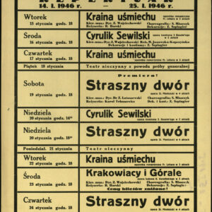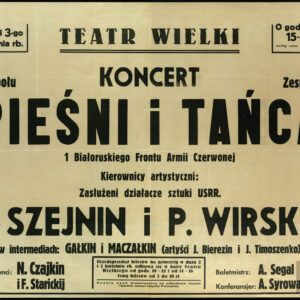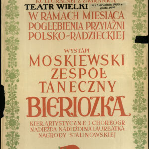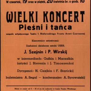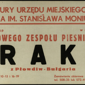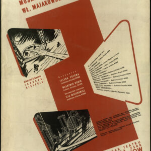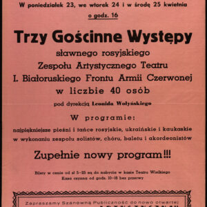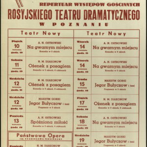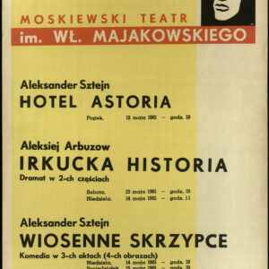 12.05.1961–15.05.1961Plakat gościnnych występów artystów Moskiewskiego Teatru im. Włodzimierza Majakowskiego w spektaklach Irkucka historia Aleksieja Arbuzowa i Wiosenne skrzypce Aleksandra Sztejna