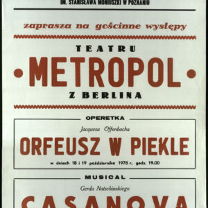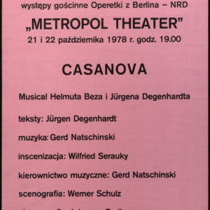 26.01.1978–14.02.1978Afisz gościnnych występów artystów niemieckiego Teatru Metropol z operetką Orfeusz w piekle Jacques’a Offenbacha oraz musicalem Casanova Helmuta Beza i Jürgena Degenhardta