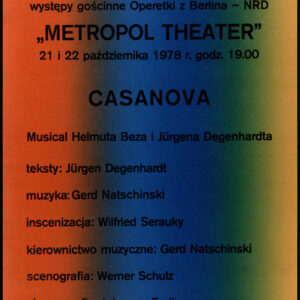 18.10.1978–22.10.1978Afisz gościnnych występów artystów niemieckiego Teatru Metropol z musicalem Casanova Helmuta Beza i Jürgena Degenhardta