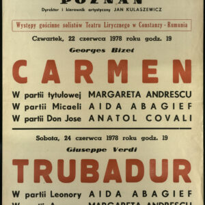 03.09.1978Afisz gościnnych występów artystów rumuńskich w spektaklach operowych Carmen Georges’a Bizeta oraz Trubadur Giuseppe Verdiego na deskach Opery