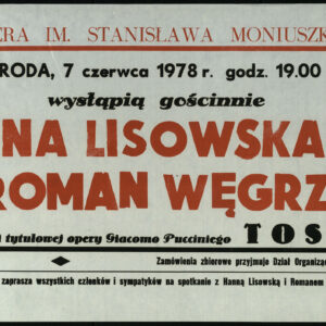 08.06.1978Afisz gościnnego występu Hanny Lisowskiej w partii tytułowej oraz Romana Węgrzyna w partii Cavaradossiego w operze Tosca Giacoma Pucciniego
