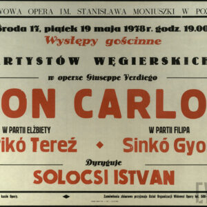 21.05.1978Afisz gościnnych występów węgierskich artystów Karikó Teréz w partii Elżbiety oraz Sinkó Gyorgy w partii Filipa w operze Don Carlos Giuseppe Verdiego