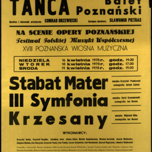 17.05.1978–19.05.1978Afisz spektakli baletowych Stabat Mater, III Symfonia oraz Krzesany w wykonaniu Polskiego Teatru Tańca Baletu Poznańskiego na deskach Opery