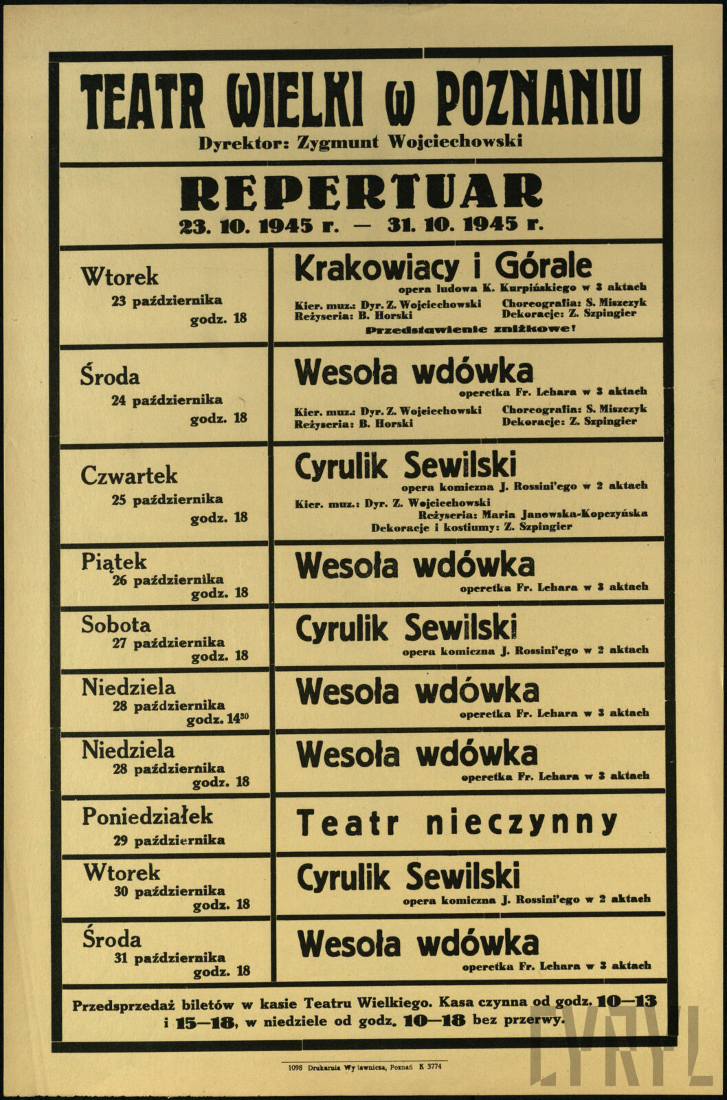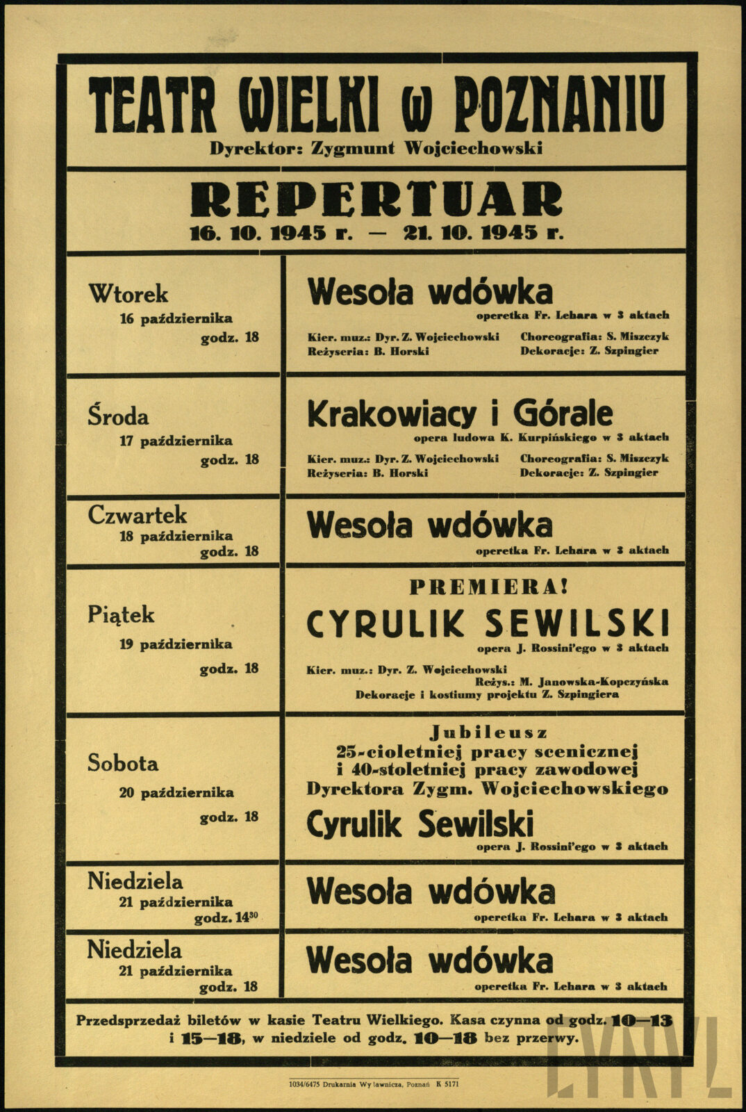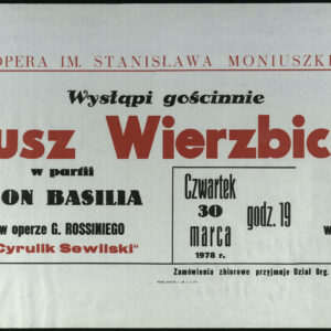 16.04.1976–19.04.1978Afisz gościnnych występów solisty Tadeusza Wierzbickiego w partii Don Basilia w operze Cyrulik sewilski Gioacchina Rossiniego i w partii Filipa w operze Don Carlos Giuseppe Verdiego