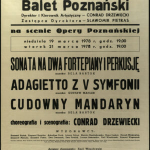 29.03.1978–30.03.1978Afisz spektakli baletowych Sonata na dwa fortepiany i perkusję, Adagietto z V symfonii oraz Cudowny mandaryn w wykonaniu Polskiego Teatru Tańca Baletu Poznańskiego na deskach Opery