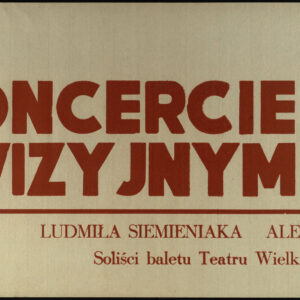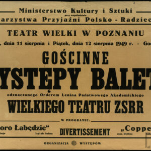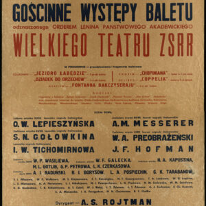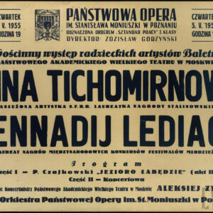 08.07.1955–13.07.1955Afisz gościnnych występów rosyjskich artystów baletowych Iriny Tichomirnowej i Gennadija Lediacha w balecie Jezioro łabędzie Piotra Czajkowskiego oraz koncertu fortepianowego Aleksieja Zybcewa