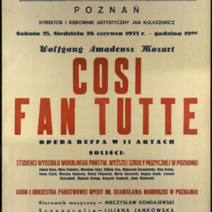 12.11.1977–13.11.1977Afisz spektaklu operowego Così fan tutte Wolfganga Amadeusa Mozarta w wykonaniu studentów Wydziału Wokalnego Państwowej Wyższej Szkoły Muzycznej w Poznaniu