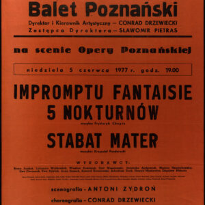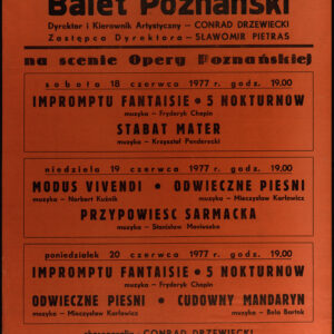 25.06.1977–26.06.1977Afisz spektakli baletowych Impromptu fantaisie, 5 nokturnów, Stabat Mater, Modus Vivendi, Odwieczne pieśni, Przypowieść sarmacka oraz Cudowny mandaryn