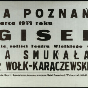 20.03.1977–22.03.1977Afisz gościnnych występów solistów baletowych Teatru Wielkiego w Warszawie Renaty Smukały oraz Waldemara Wołk-Karaczewskiego w spektaklu baletowym Giselle Adolphe Adama