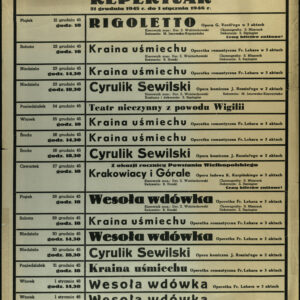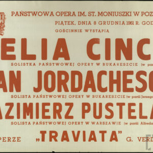 14.12.1961Afisz gościnnego występu rumuńskich i polskich solistów Leli Cincu, Dana Jordachescu i Kazimierza Pustelaka w spektaklu Traviata Giuseppe Verdiego