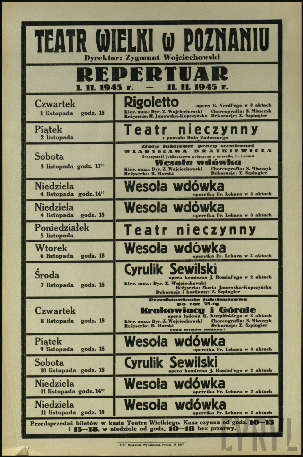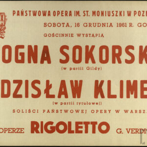 08.12.1961Afisz gościnnego występu solistów Bogny Sokorskiej i Zdzisława Klimka w spektaklu Rigoletto Giuseppe Verdiego