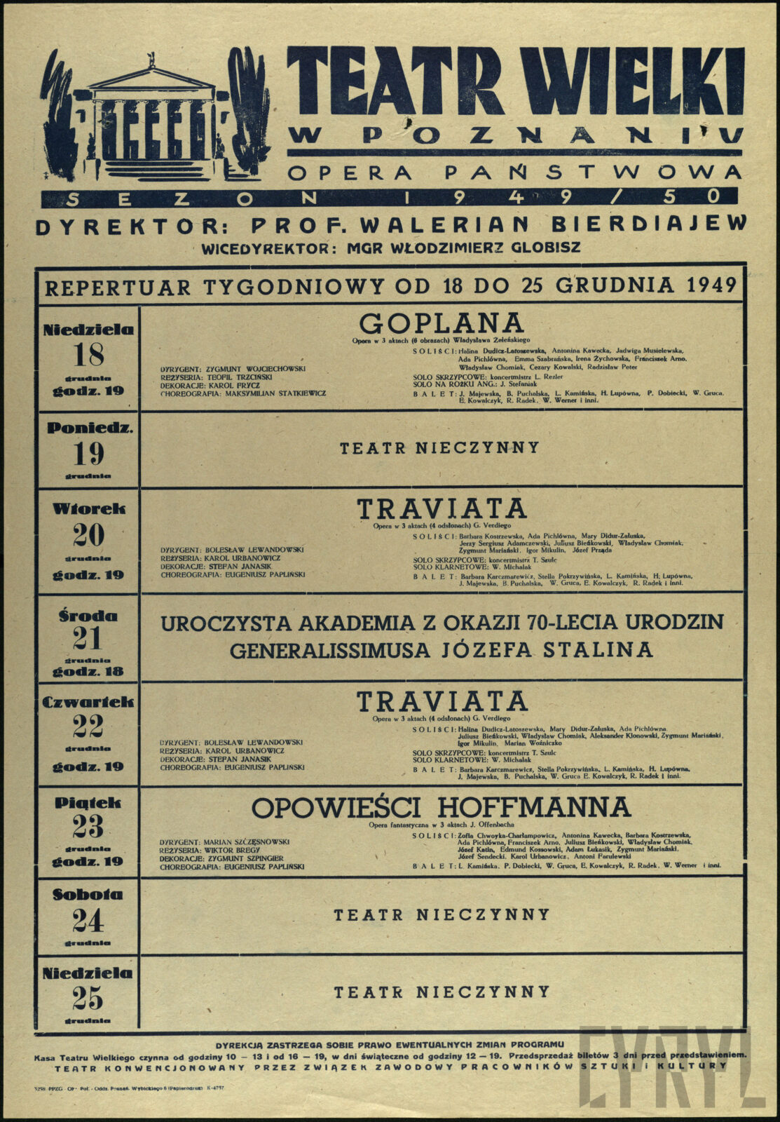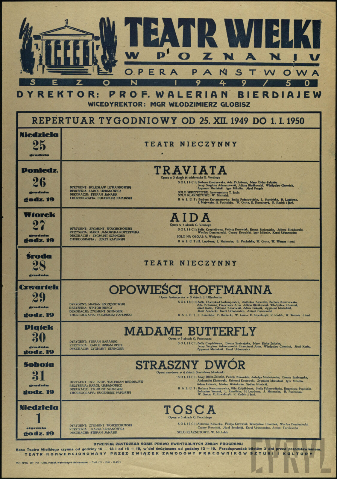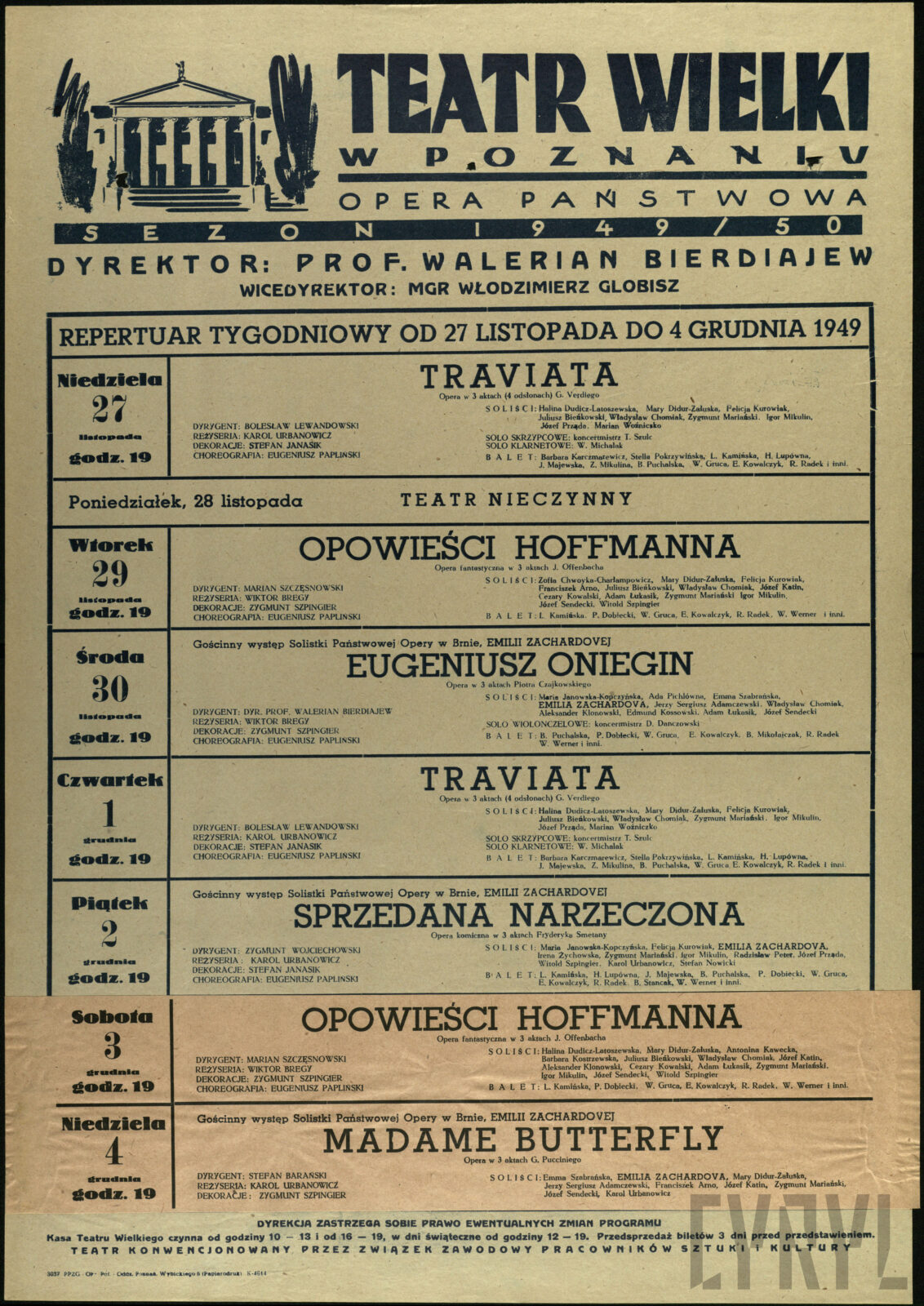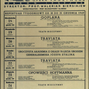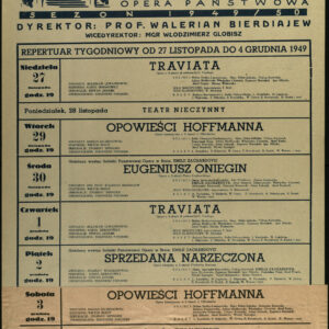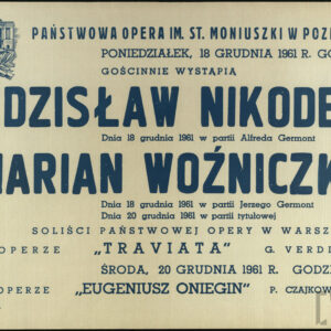 16.12.1961Afisz gościnnych występów solistów Zdzisława Nikodema i Mariana Woźniczko w spektaklach operowych Traviata Giuseppe Verdiego i Eugeniusz Oniegin Piotra Czajkowskiego