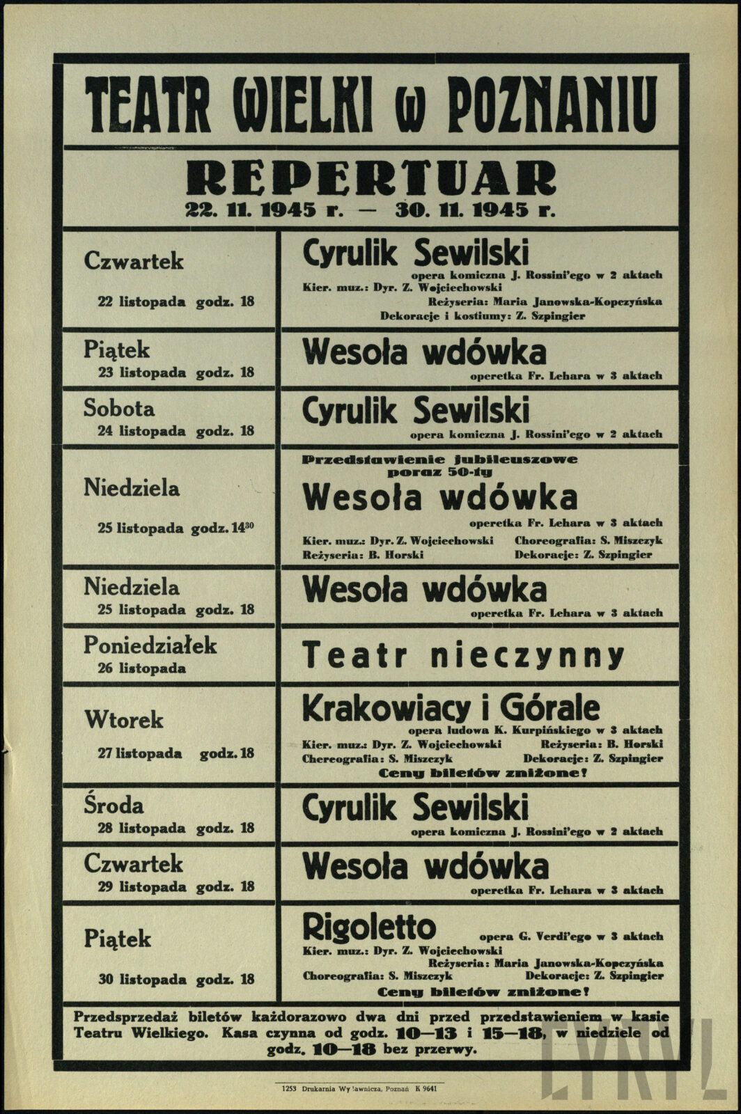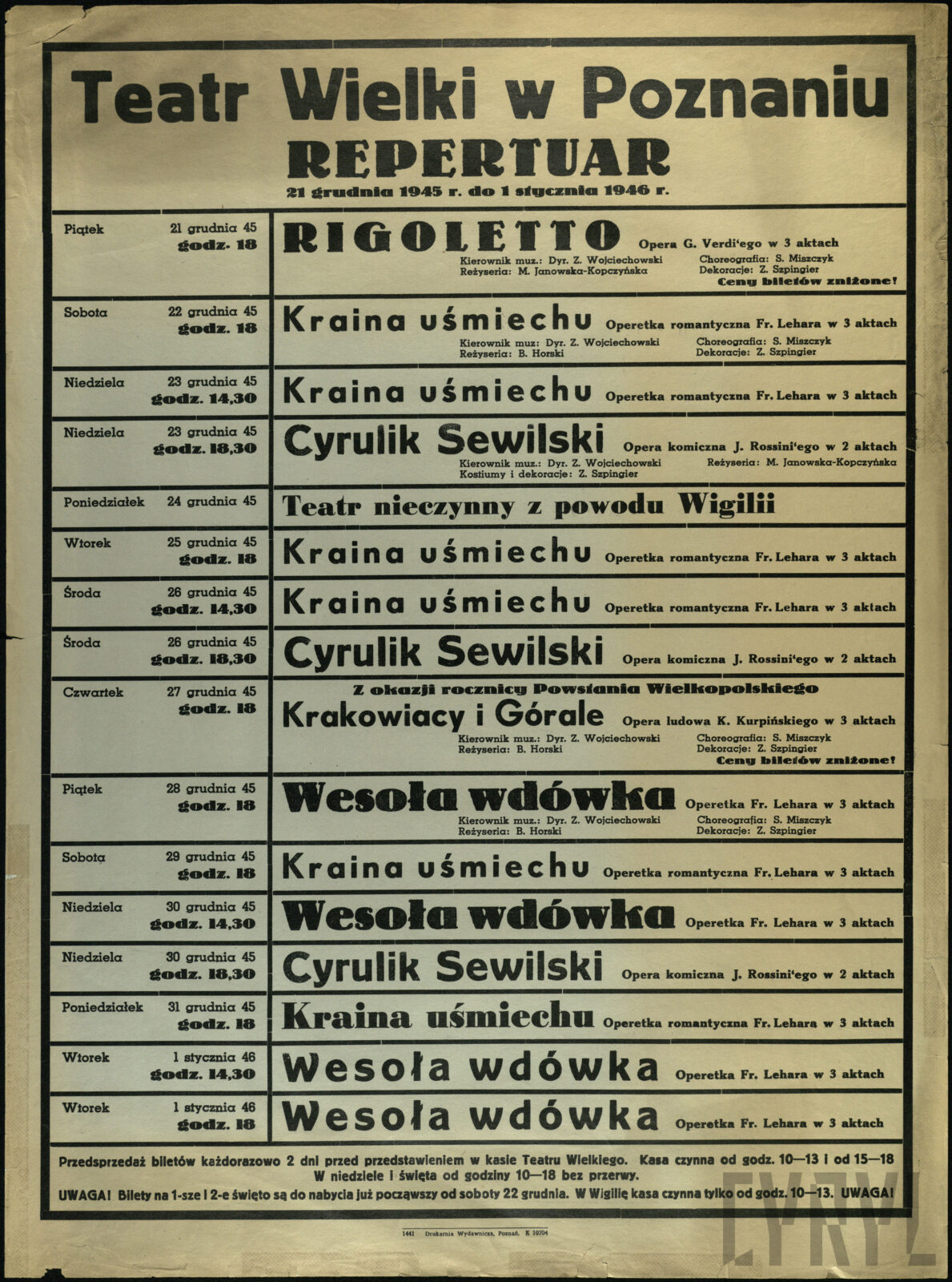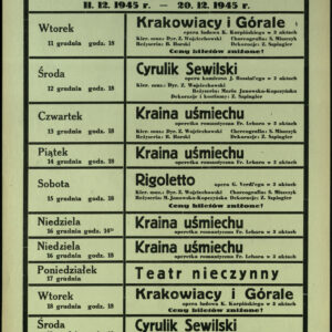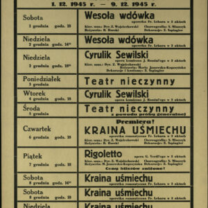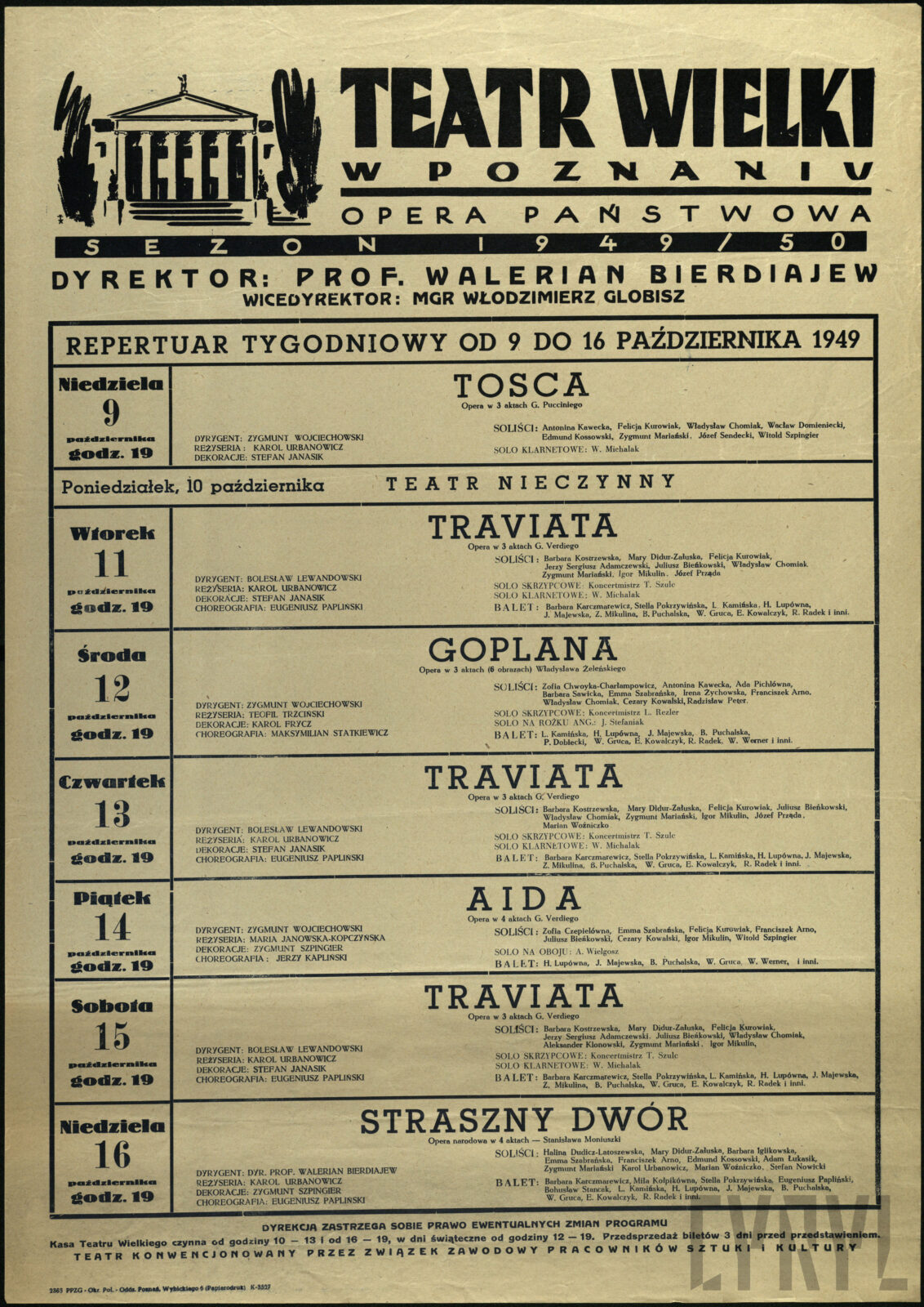 16.12.1961Afisz gościnnych występów solistów Zdzisława Nikodema i Mariana Woźniczko w spektaklach operowych Traviata Giuseppe Verdiego i Eugeniusz Oniegin Piotra Czajkowskiego