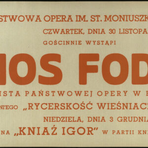 18.12.1961–20.12.1961Afisz gościnnych występów węgierskiego solisty Janosa Fodora w spektaklu operowym Rycerskość wieśniacza Pietro Mascagniego i Kniaź Igor Aleksandra Borodina