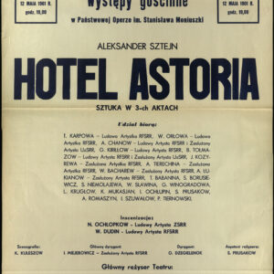 1961Afisz gościnnych występów artystów Moskiewskiego Teatru im. Włodzimierza Majakowskiego w spektaklu Hotel Astoria Aleksandra Sztejna
