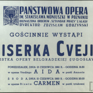 18.11.1960Afisz gościnnych występów solistki Opery Belgradzkiej Biserki Cvejić w spektaklu operowym Aida Giuseppe Verdiego i Carmen Georges’a Bizeta