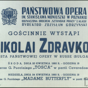 27.04.1960–30.04.1960Afisz gościnnych występów bułgarskiego solisty Nikolaja Zdravkova w spektaklu operowym Tosca Giacoma Pucciniego i Madame Butterfly Giacoma Pucciniego