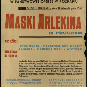 07.02.1960Afisz gościnnego występu artystów Wrocławskiego Teatru Pantomimy pod dyrekcją Henryka Tomaszewskiego w spektaklu Maski Arlekina