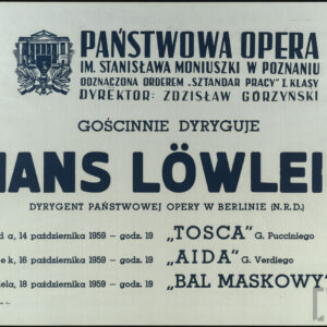 30.11.1959Afisz spektakli operowych Tosca Giacoma Pucciniego, Aida i Bal maskowy Giuseppe Verdiego z gościnnym udziałem niemieckiego dyrygenta Hansa Löwleina
