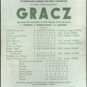 10.06.1959–11.06.1959Afisz gościnnego występu artystów Państwowego Leningradzkiego Akademickiego Teatru Dramatycznego im. Puszkina w spektaklu Gracz Fiodora Dostojewskiego