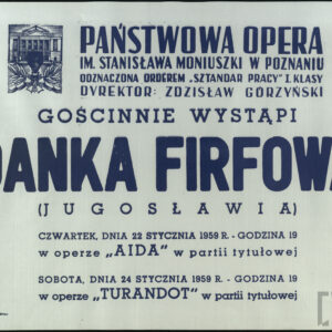 08.06.1959Afisz gościnnych występów solistki z Jugosławii Danki Firfowej w spektaklach operowych Aida Giuseppe Verdiego i Turandot Giacoma Pucciniego