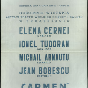 07.12.1958–10.12.1958Afisz gościnnego występu rumuńskich artystów Eleny Cernei, Ionela Tudorana, Michaila Arnauta pod batutą Jeana Bobescu w spektaklu operowym Carmen Georges’a Bizeta