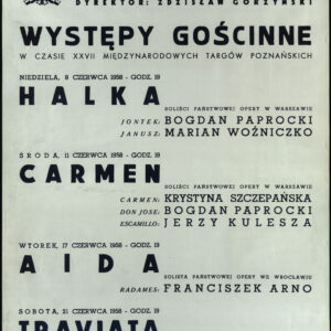 06.07.1958Afisz gościnnych występów solistów Oper Warszawskiej, Wrocławskiej i Łódzkiej w spektaklach Halka Stanisława Moniuszki, Carmen Georges’a Bizeta, Aida i Traviata Giuseppe Verdiego
